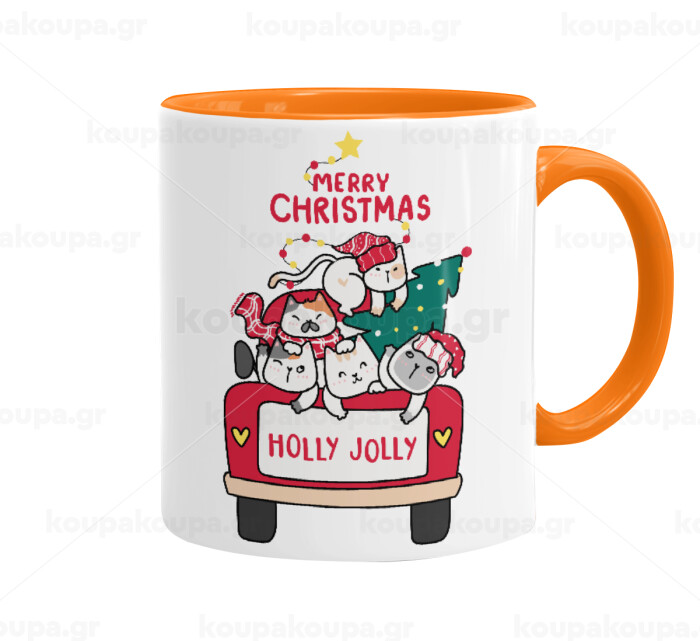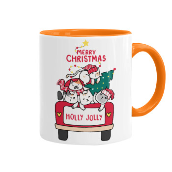Merry Christmas cats in car, Mug colored orange, ceramic, 330ml