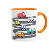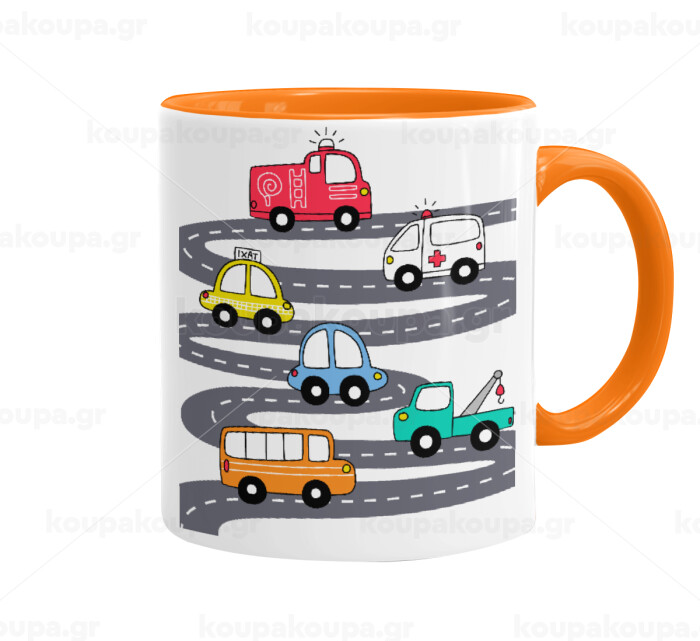 Hand drawn childish set with cars, Mug colored orange, ceramic, 330ml