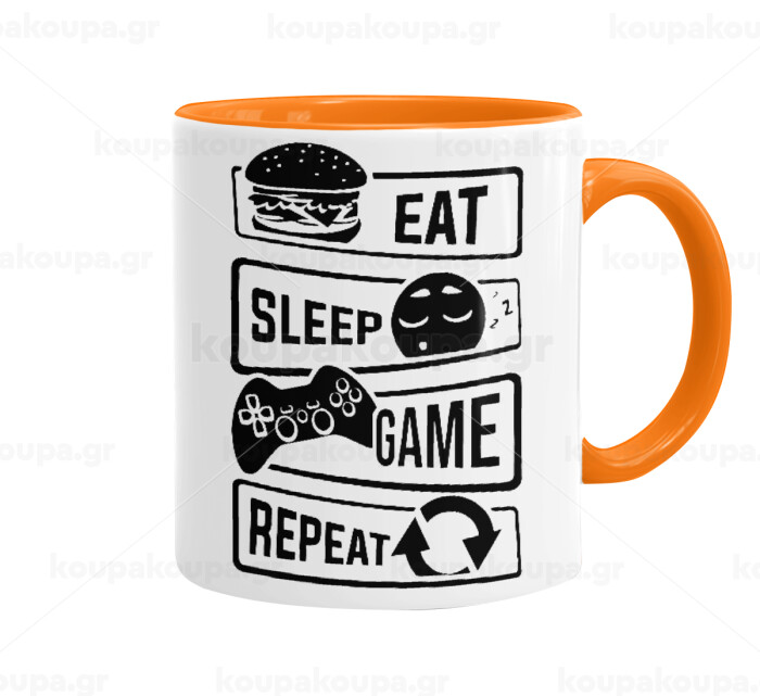 Eat Sleep Game Repeat, Mug colored orange, ceramic, 330ml