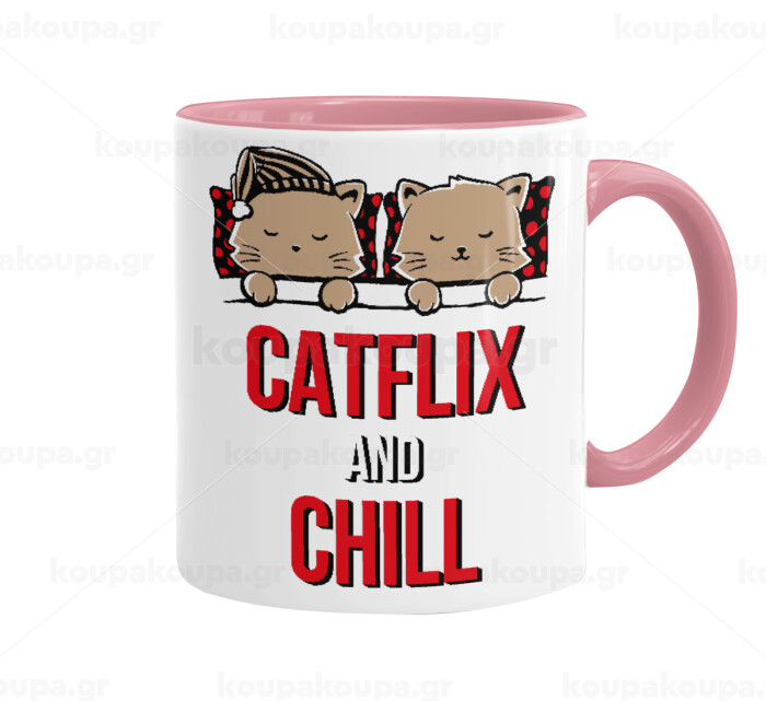 Catflix and Chill, Mug colored pink, ceramic, 330ml