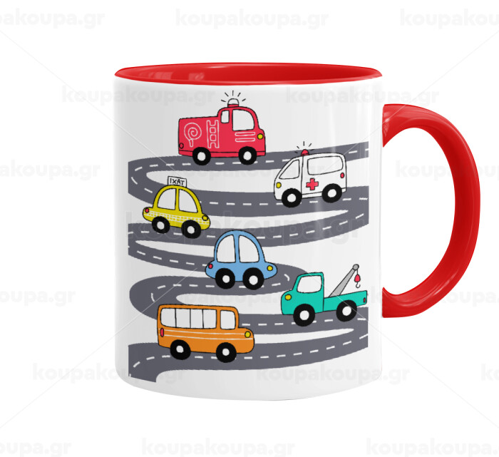 Hand drawn childish set with cars, Mug colored red, ceramic, 330ml