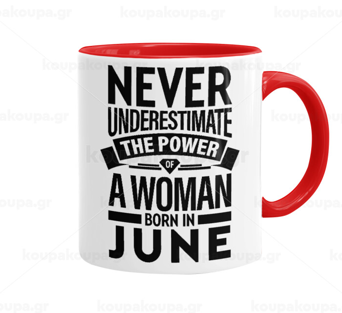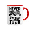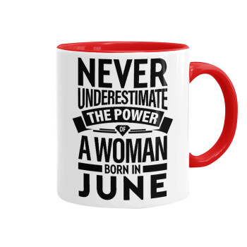 Never Underestimate the poer of a Woman born in..., Mug colored red, ceramic, 330ml