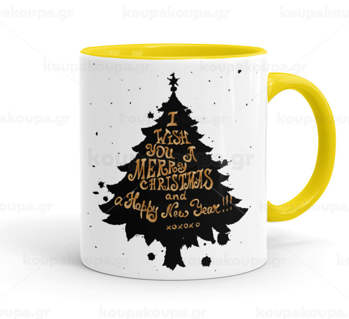 Tree, i wish you a merry christmas and a Happy New Year!!! xoxoxo, Mug colored yellow, ceramic, 330ml