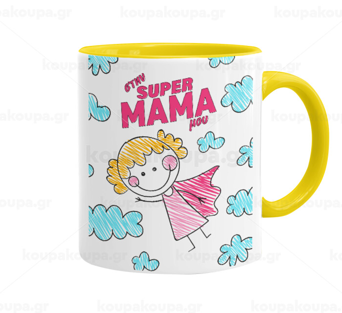 Στην SUPER μαμά μου, comic, Mug colored yellow, ceramic, 330ml