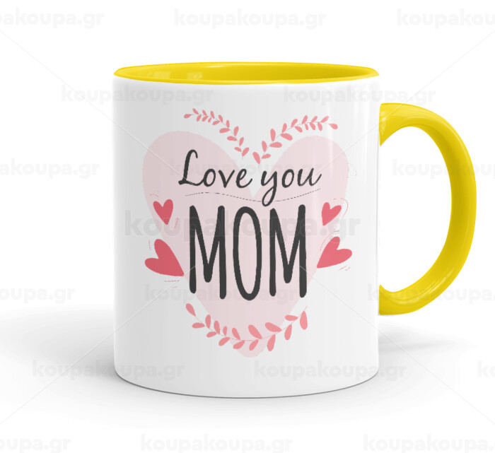 Mother's day I Love you Mom heart, Mug colored yellow, ceramic, 330ml