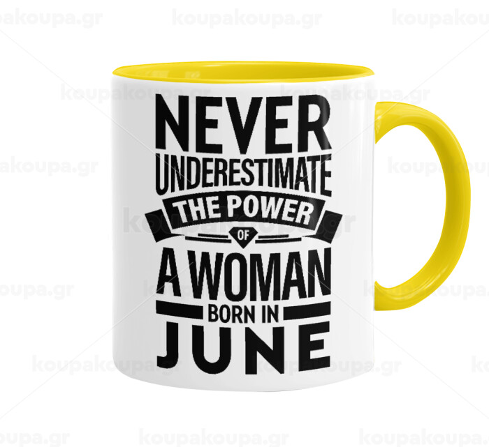 Never Underestimate the poer of a Woman born in..., Mug colored yellow, ceramic, 330ml