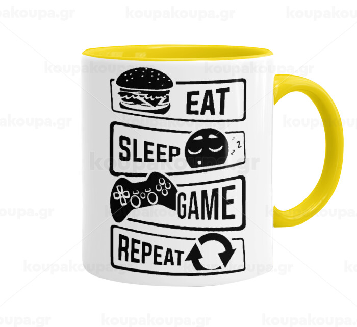 Eat Sleep Game Repeat, Mug colored yellow, ceramic, 330ml