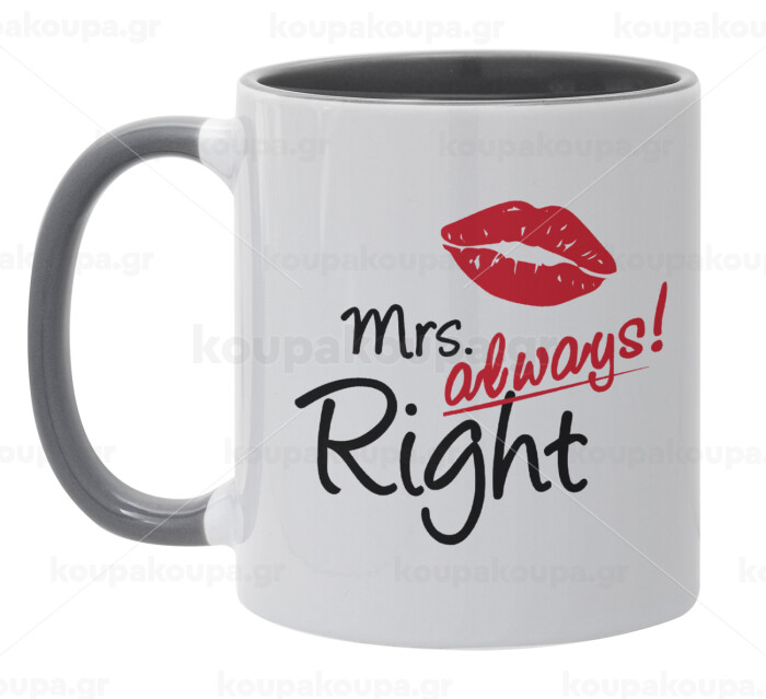 Mrs always right kiss, Mug colored grey, ceramic, 330ml