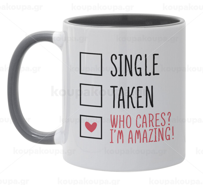 Single, Taken, Who cares i'm amazing, Mug colored grey, ceramic, 330ml