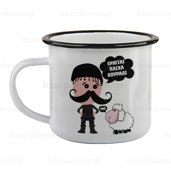 Κρητικός "Έρχεται Πάσχα κουράδι", Κούπα εμαγιέ με μαύρο χείλος 360ml