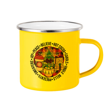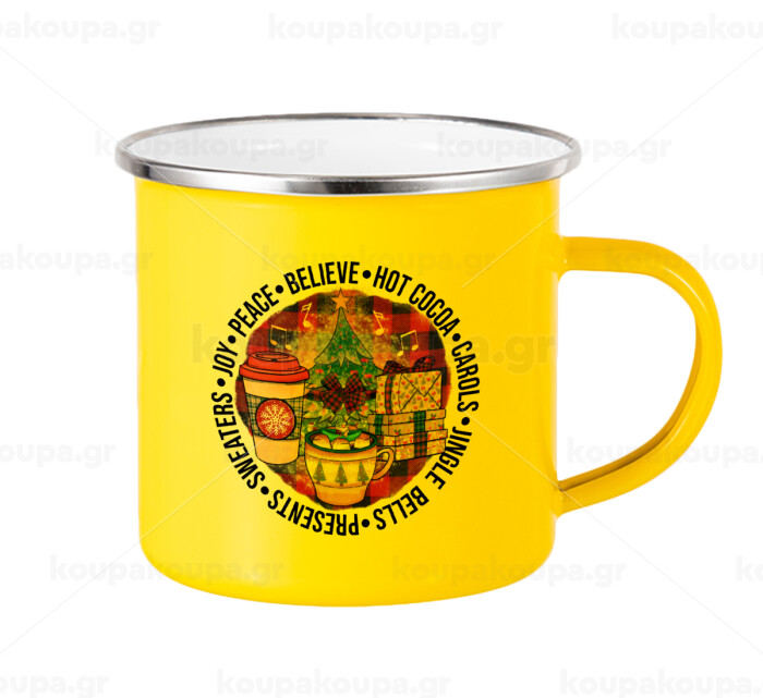 Joy, Peace, Believe, Hot Cocoa, Carols, Yellow Enamel Metallic Cup 360ml