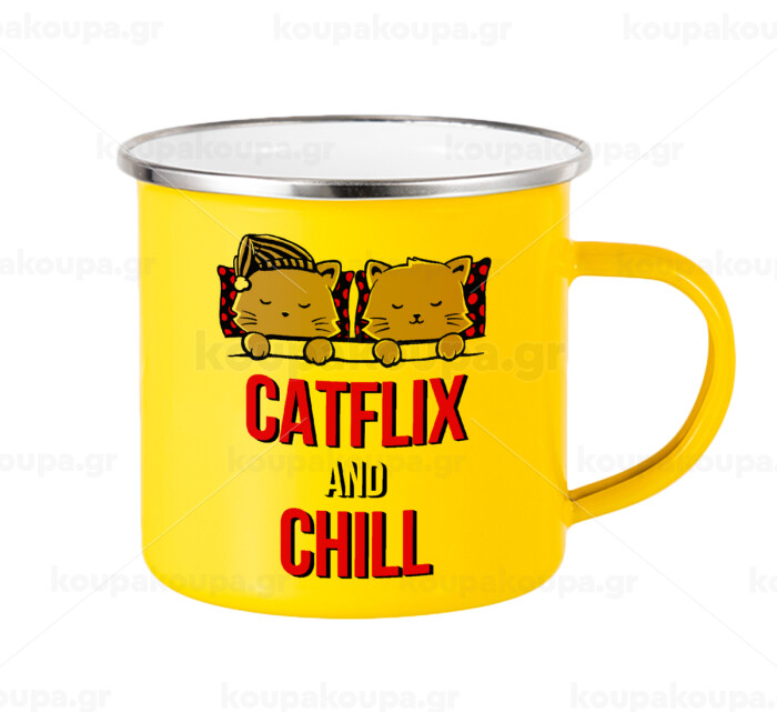 Catflix and Chill, Yellow Enamel Metallic Cup 360ml