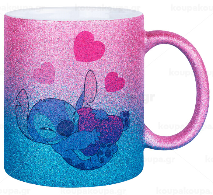 Lilo & Stitch hugs and hearts, Κούπα Χρυσή/Μπλε Glitter, κεραμική, 330ml