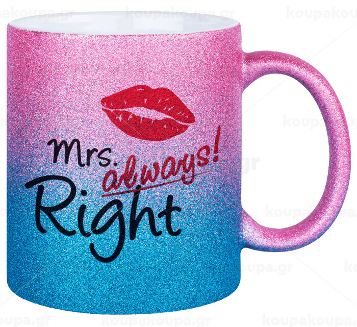 Mrs always right kiss, Κούπα Χρυσή/Μπλε Glitter, κεραμική, 330ml
