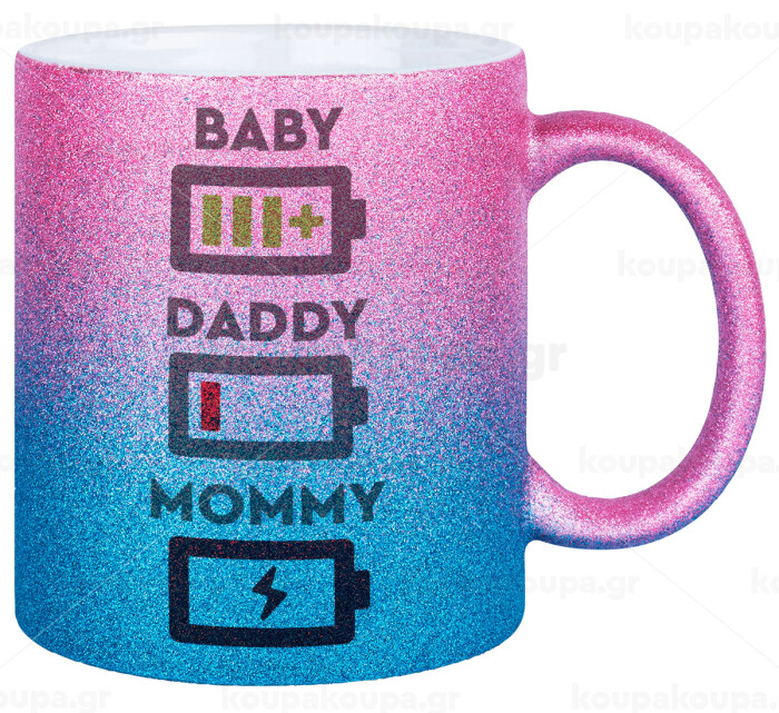 BABY, MOMMY, DADDY Low battery, Κούπα Χρυσή/Μπλε Glitter, κεραμική, 330ml