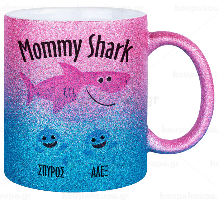 Mommy Shark (με ονόματα παιδικά), Κούπα Χρυσή/Μπλε Glitter, κεραμική, 330ml