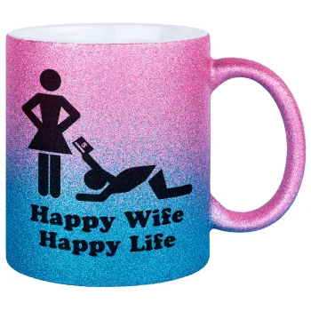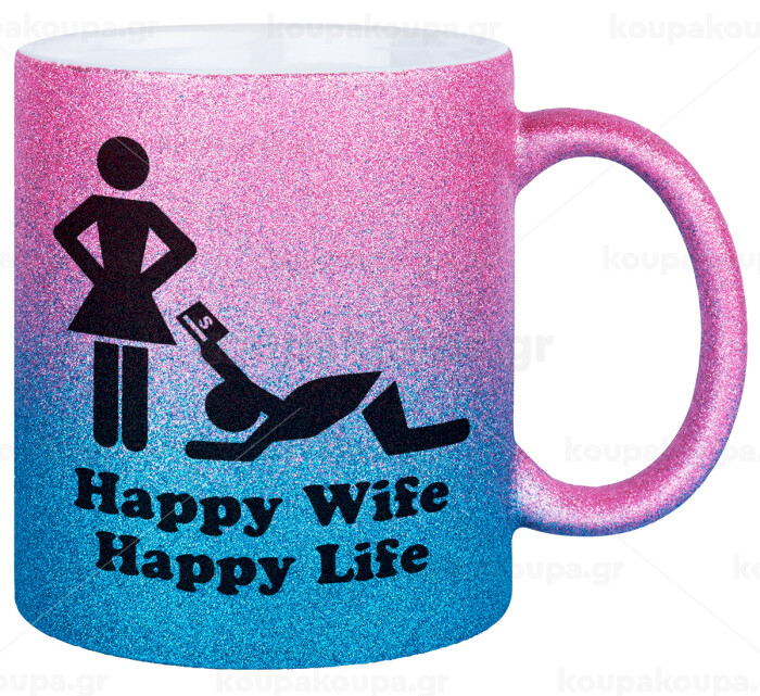 Happy Wife, Happy Life, Κούπα Χρυσή/Μπλε Glitter, κεραμική, 330ml