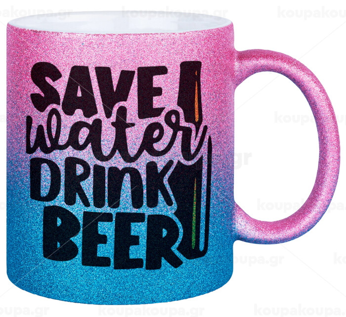 Save Water, Drink BEER, Κούπα Χρυσή/Μπλε Glitter, κεραμική, 330ml