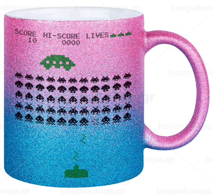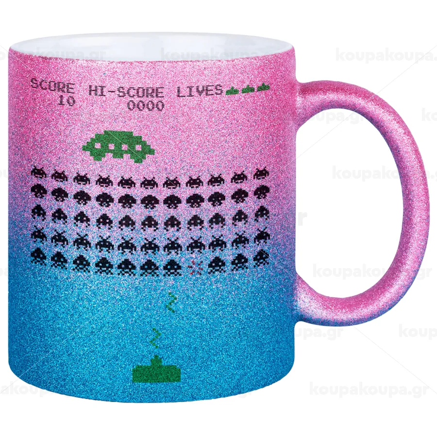Space invaders, Κούπα Χρυσή/Μπλε Glitter, κεραμική, 330ml