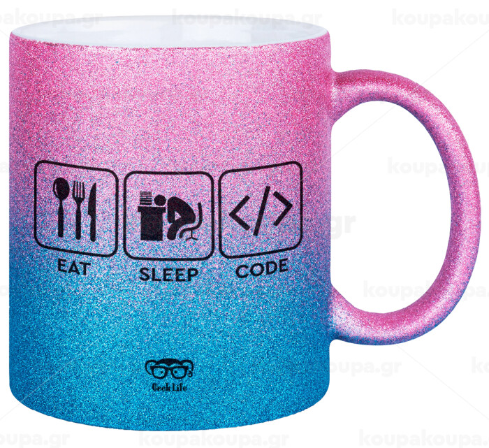 Eat Sleep Code, Κούπα Χρυσή/Μπλε Glitter, κεραμική, 330ml