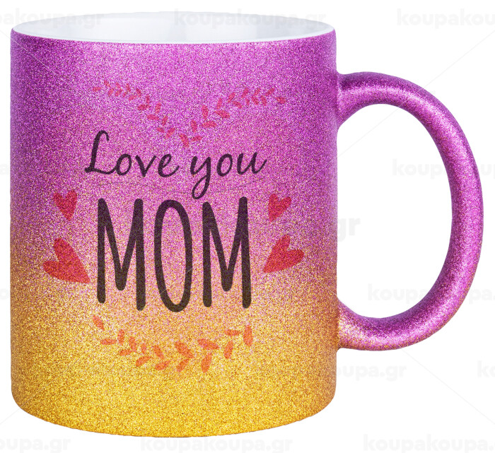 Mother's day I Love you Mom heart, Κούπα Χρυσή/Ροζ Glitter, κεραμική, 330ml