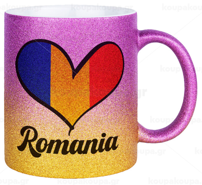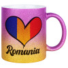 Romania flag, Κούπα Χρυσή/Ροζ Glitter, κεραμική, 330ml
