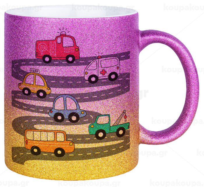 Hand drawn childish set with cars, Κούπα Χρυσή/Ροζ Glitter, κεραμική, 330ml