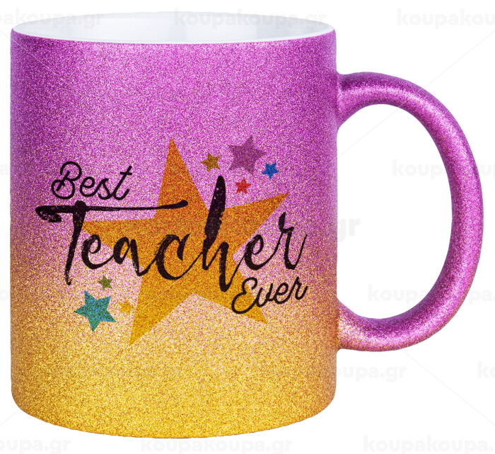 Teacher super star!!!, Κούπα Χρυσή/Ροζ Glitter, κεραμική, 330ml
