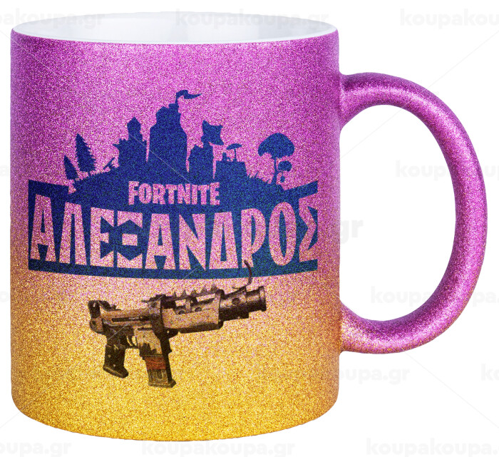 Fortnite with gun με το όνομα σου, Κούπα Χρυσή/Ροζ Glitter, κεραμική, 330ml
