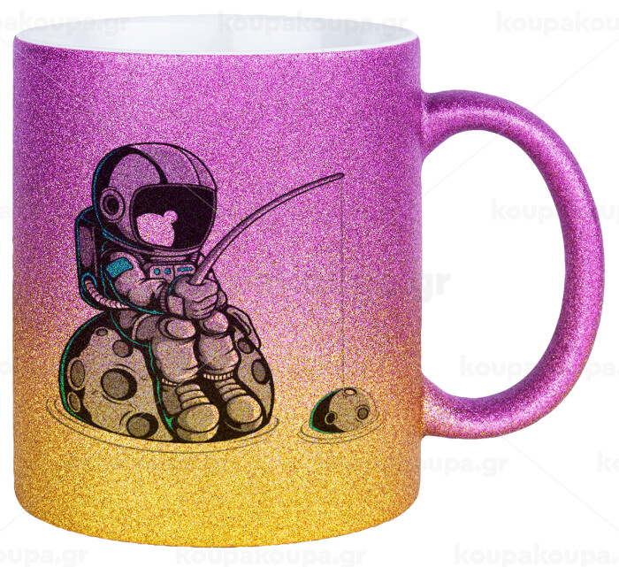 Little astronaut fishing, Κούπα Χρυσή/Ροζ Glitter, κεραμική, 330ml