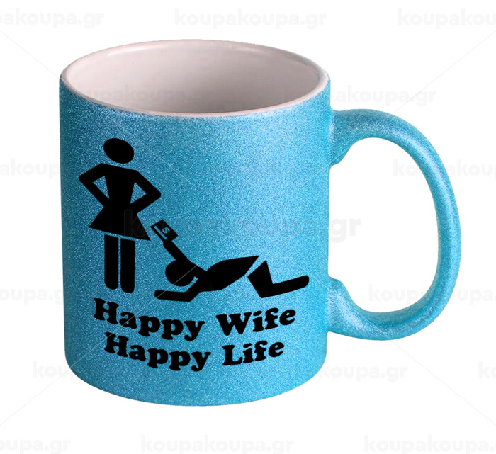 Happy Wife, Happy Life, Κούπα Σιέλ Glitter που γυαλίζει, κεραμική, 330ml