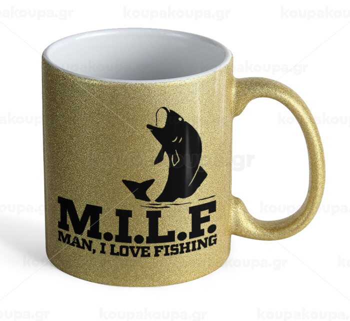M.I.L.F. Mam i love fishing, Κούπα Χρυσή Glitter που γυαλίζει, κεραμική, 330ml