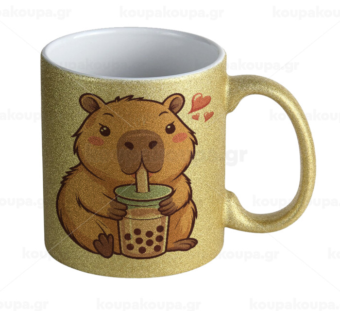 Capybara Bubble Tea, Κούπα Χρυσή Glitter που γυαλίζει, κεραμική, 330ml