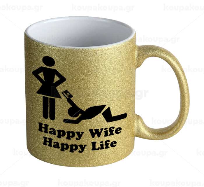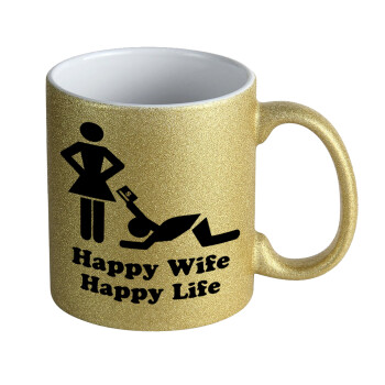 Happy Wife, Happy Life, Κούπα Χρυσή Glitter που γυαλίζει, κεραμική, 330ml