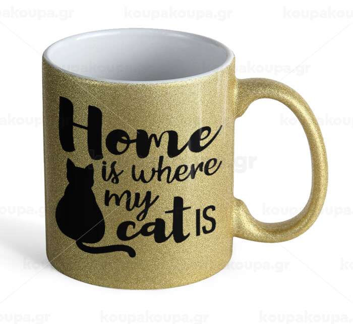 Home is where my cat is!, Κούπα Χρυσή Glitter που γυαλίζει, κεραμική, 330ml