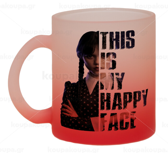 Wednesday, This is my happy face, Κούπα γυάλινη δίχρωμη με βάση το κόκκινο ματ, 330ml