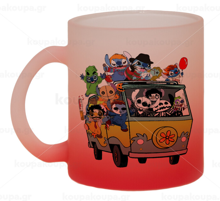 Stitch Halloween scooby car, Κούπα γυάλινη δίχρωμη με βάση το κόκκινο ματ, 330ml