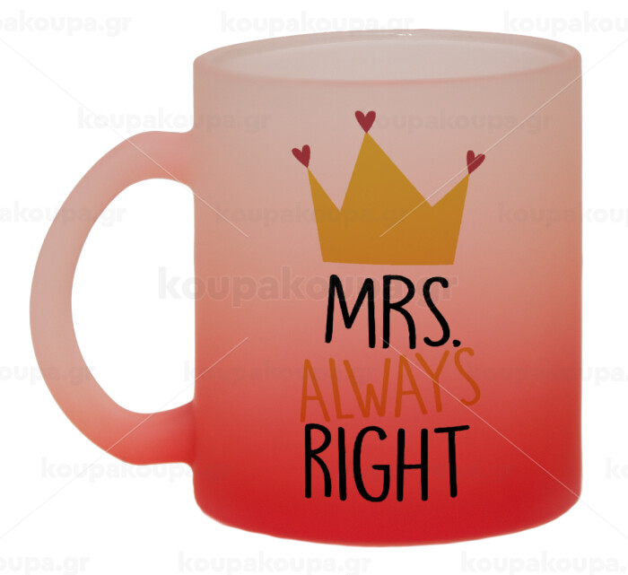 Mrs "Always" right, Κούπα γυάλινη δίχρωμη με βάση το κόκκινο ματ, 330ml