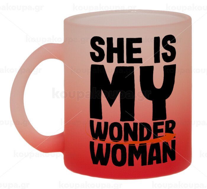 She is my wonder woman, Κούπα γυάλινη δίχρωμη με βάση το κόκκινο ματ, 330ml