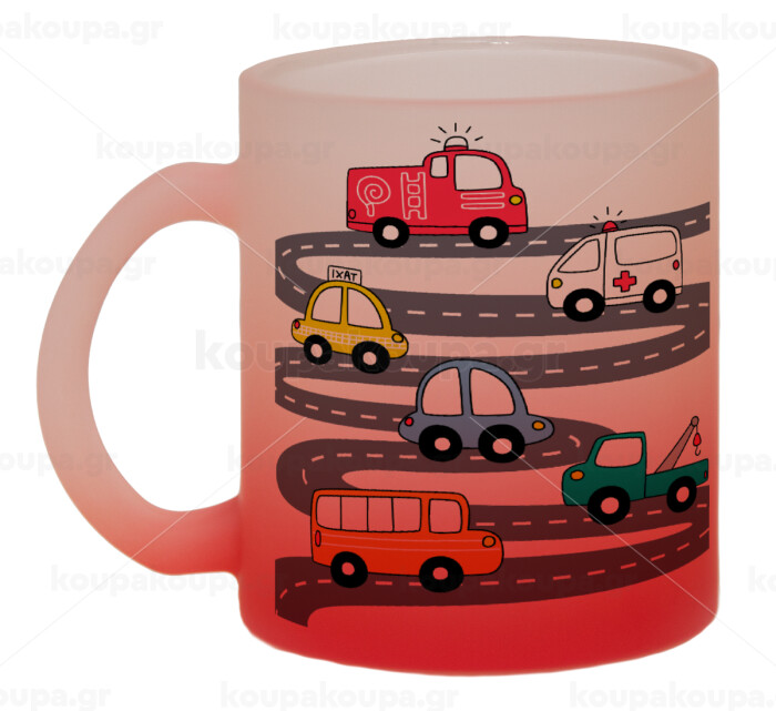 Hand drawn childish set with cars, Κούπα γυάλινη δίχρωμη με βάση το κόκκινο ματ, 330ml