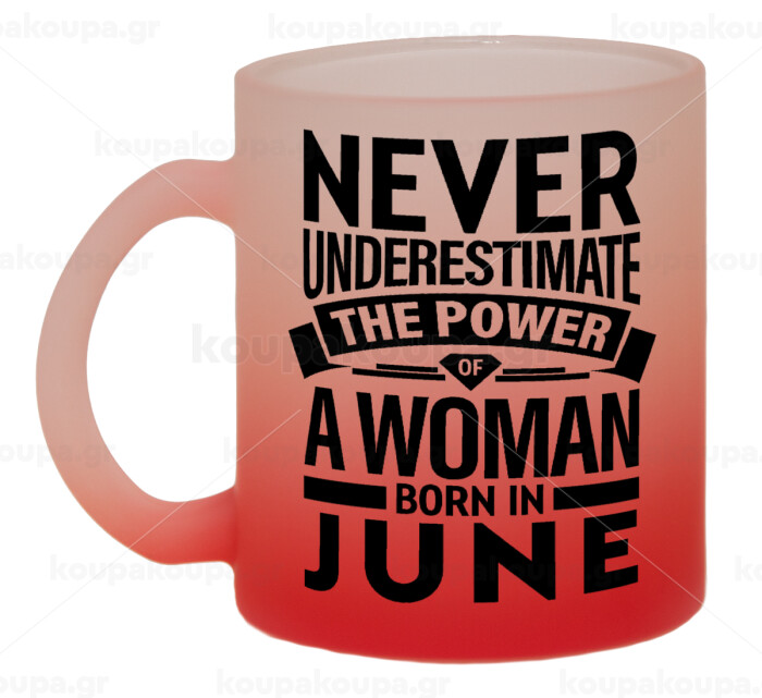 Never Underestimate the poer of a Woman born in..., Κούπα γυάλινη δίχρωμη με βάση το κόκκινο ματ, 330ml