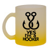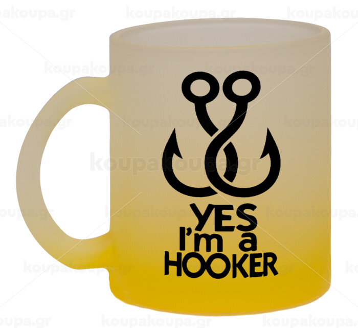 Yes i am Hooker, Κούπα γυάλινη δίχρωμη με βάση το κίτρινο ματ, 330ml