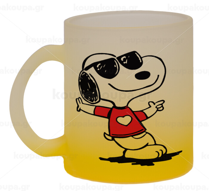Snoopy καρδούλα, Κούπα γυάλινη δίχρωμη με βάση το κίτρινο ματ, 330ml