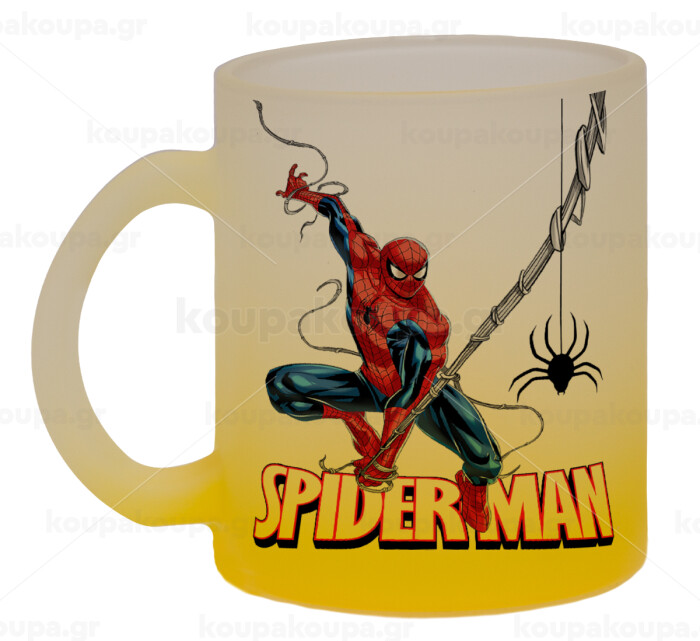 Spiderman fly, Κούπα γυάλινη δίχρωμη με βάση το κίτρινο ματ, 330ml