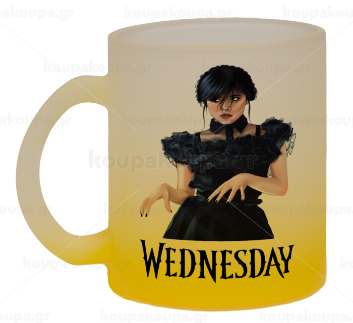 Wednesday Adams, dance with hands, Κούπα γυάλινη δίχρωμη με βάση το κίτρινο ματ, 330ml