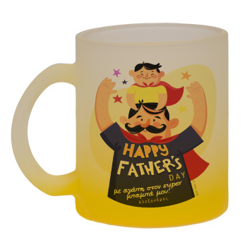 Happy Fathers Day με όνομα, Κούπα γυάλινη δίχρωμη με βάση το κίτρινο ματ, 330ml