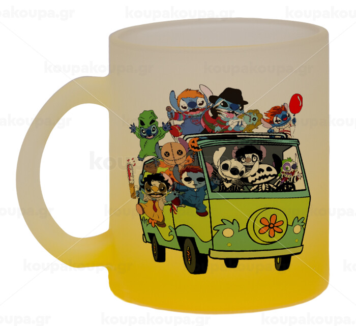 Stitch Halloween scooby car, Κούπα γυάλινη δίχρωμη με βάση το κίτρινο ματ, 330ml