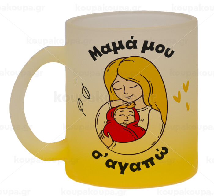 Μανούλα σ'αγαπώ αγκαλιά!, Κούπα γυάλινη δίχρωμη με βάση το κίτρινο ματ, 330ml