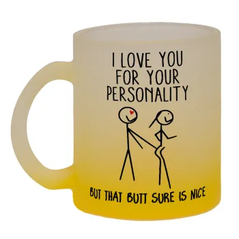 I Love you for your personality, Κούπα γυάλινη δίχρωμη με βάση το κίτρινο ματ, 330ml