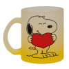 Snoopy takemy heart, Κούπα γυάλινη δίχρωμη με βάση το κίτρινο ματ, 330ml